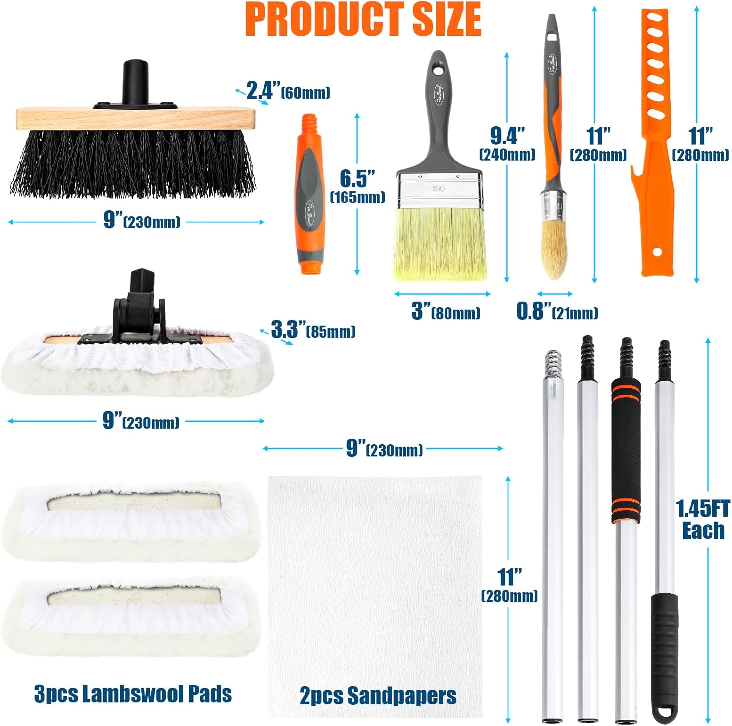 | Included Components | 1 x 9 inch 180° Adjustable Lambskin Applicator, 3 x Natural Lambswool Refill Pads, 1 x 9 inch Scrub brush, 1 x 3 inch Flat Brush, 1 x 0.8 inch Trim Brush, 1 x Paint stirrer, 2 x Sanding papers, 4 x 1.45ft Aluminum Extension Poles, 1 x Handle |