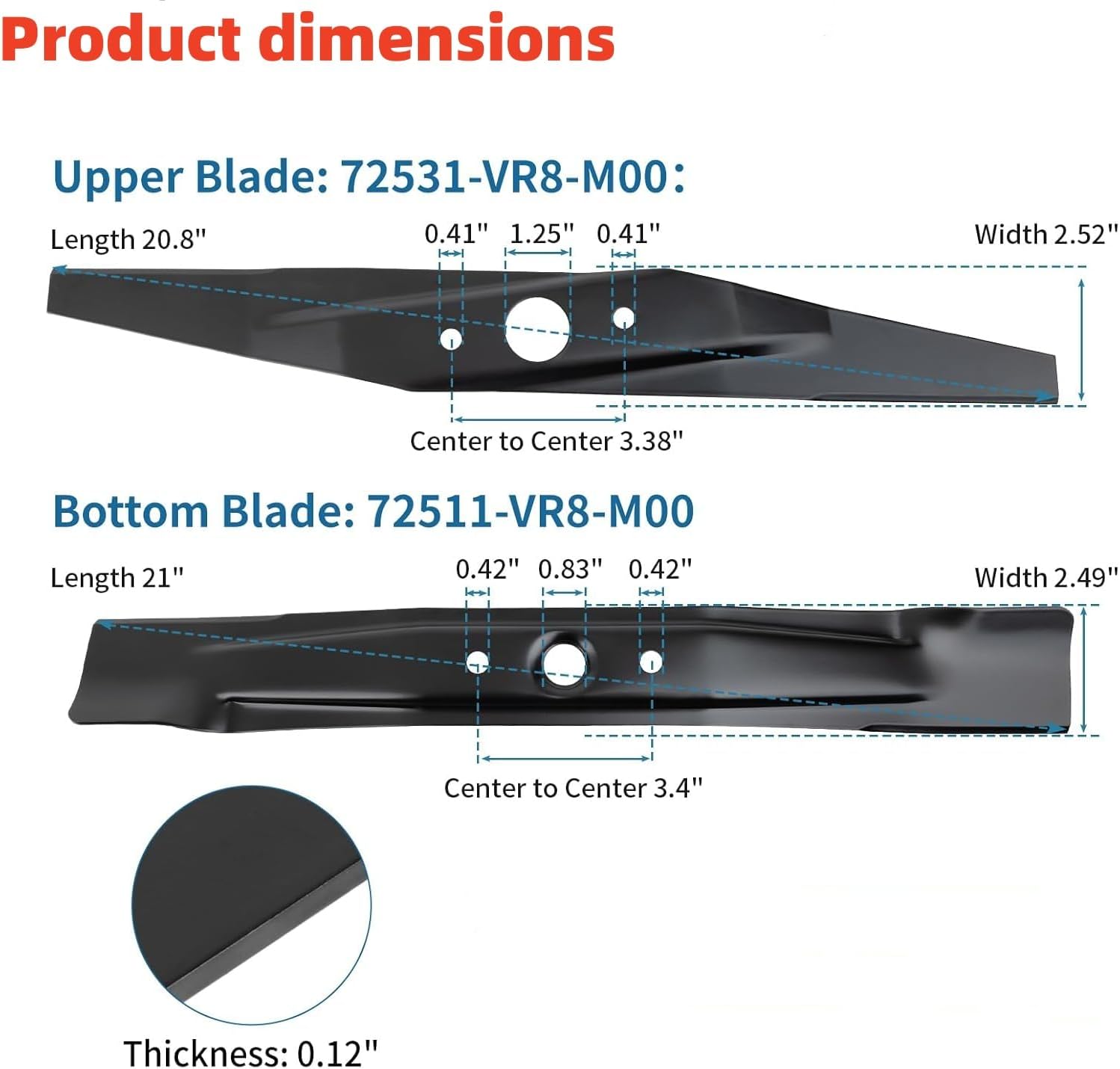 Replace part numbers: The lawnmower blade set replaces part numbers 08720-VR8-M00 (set), Top Blade: 72531-VR8-M00, and Bottom Blade: 72511-VR8-M00. Compatible with the following 21-Inch Deck Push and Propelled Mower: The 72531-VR8-M00 & 72511-VR8-M00 Replacement Blade Set is designed to be perfectly compatible with Hon da lawn mower models HRN216PKA, HRN216PKAA, HRN216VKA, HRN216VKAA, HRN216VLA, HRN216VLAA, HRN216VYA, HRN216VYAA. For Deck Size 21 inches Blade Mulching Blade Upper Blade (72511-VR8-M00) Length: 20.9" Width: 2.52" Thickness: 0.12" Center Hole: 1.25" Center to Center: 3.38" Outer Hole: 0.41" For Deck Size: 21 inches Bottom Blade (72531-VR8-M00) Length: 21" Width: 2.49" Thickness: 0.12" Center Hole: 0.83" Center to Center: 3.4" Outer Hole: 0.42"