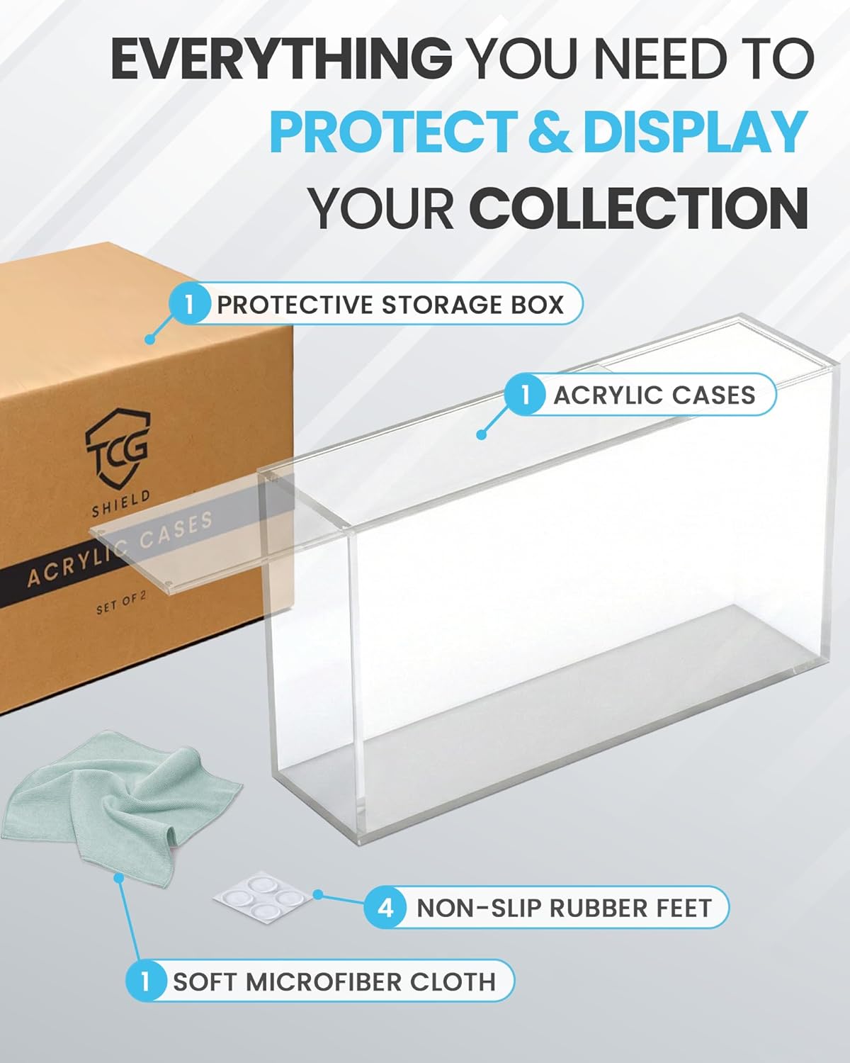 | Included Components | 1 Acrylic Display Box, 8 Attachable Rubber Feet, Microfibre Cleaning Cloth, Reusable Storage Box |