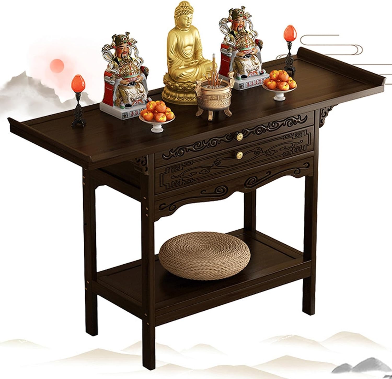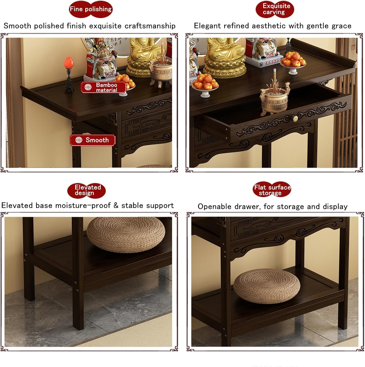 This antique-style Chinese altar table combines high-quality nanmu bamboo, classic Chinese design, multi-tiered storage compartments, thoughtful details, and a variety of size options. Not only is it sturdy, durable, and elegantly grand, but it also offers efficient storage and is both safe and practical. It can be flexibly adapted to a variety of settings, including family ancestral worship, entryway storage, and study decor, making it an excellent piece of Chinese home furnishings that seamlessly blends practicality with aesthetics.Product SpecificationsProduct Name: Altar TableMaterial: Nan Bamboo + MDFColor: Walnut / Red SandalwoodDimensions: 50x33x100cm, 50x40x100cm, 66x33x100cm, 66x40x100cm, 80x33x100cm, 80x40x100cm, 100x33x100cm, 100x40x100cm, 120x33x100cm, 120x40x100cmPackage Contents: Bamboo Meditation Altar Table x1