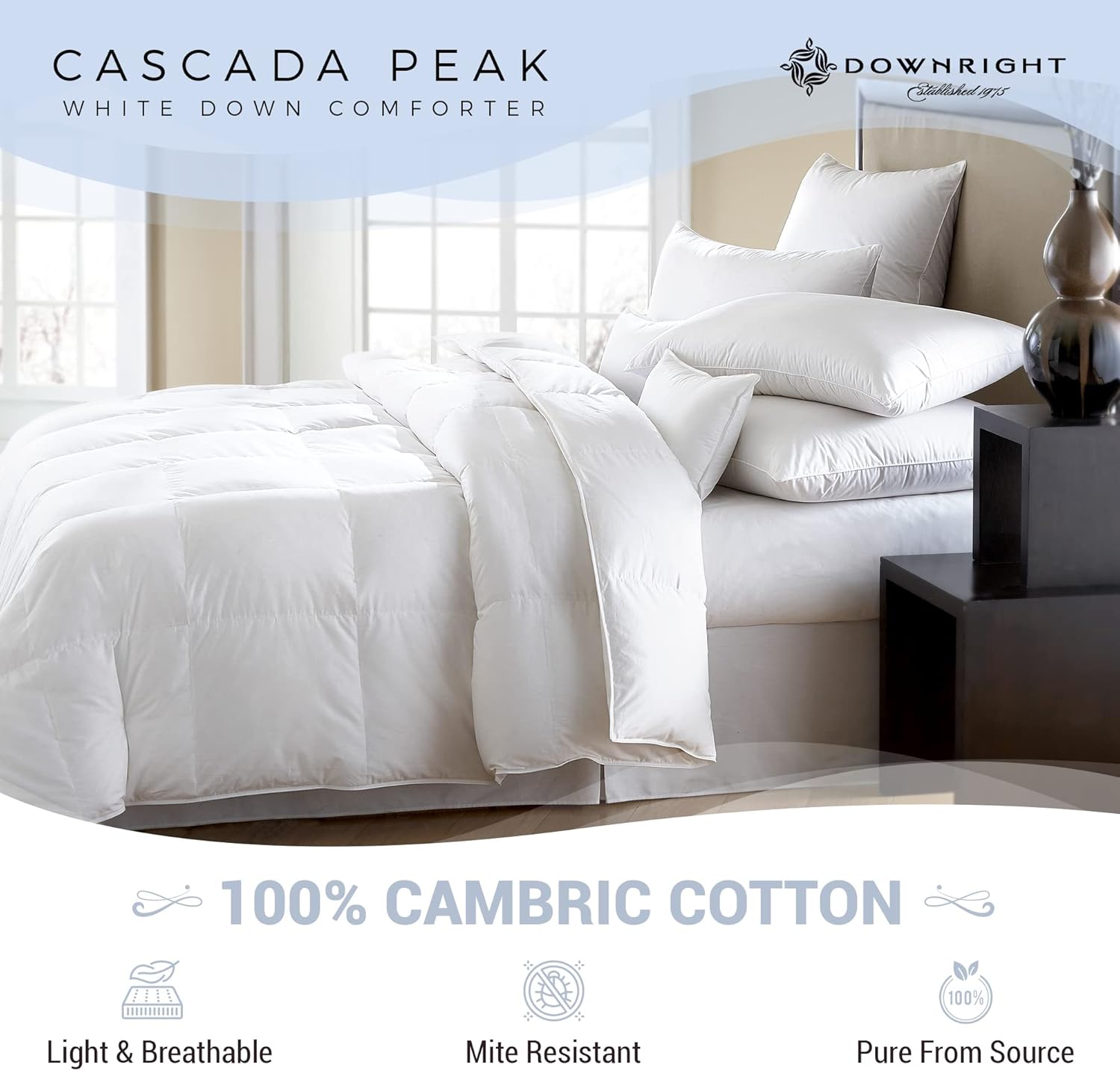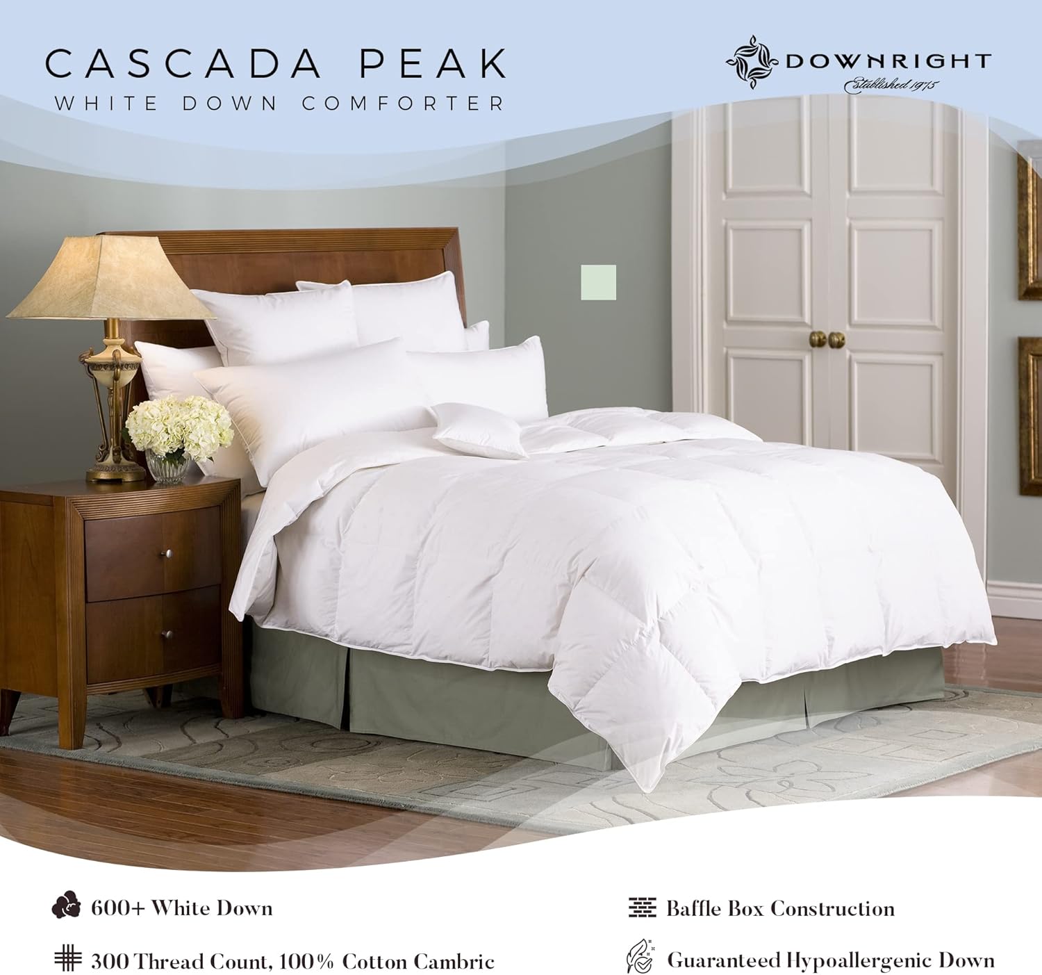 Downright Cascada Peak Luxury White Down Comforter Luxuriate in bed with this exquisite comforter, hand crafted from soft white down and finished with the finest fabrics for exceptional quality and comfort for years to come. Luxurious cotton textiles Our lovingly handcrafted down comforter is created from the highest quality, ethically sourced 100% cotton cambric with a 300 thread count, and is beautifully finished with double stitching and satin piping. Naturally insulating white down Soft, fluffy, yet resilient, the finest white down is the best in its grade, making this 600 fill power luxury comforter warm, cozy and breathable for the perfect night’s sleep all-year round. Naturally insulating white down Soft, fluffy, yet resilient, the finest white down is the best in its grade, making this 600 fill power luxury comforter warm, cozy and breathable for the perfect night’s sleep all-year round. Purified, authentic and hypoallergenic Double-washed and quadruple-rinsed with our exclusive OxyD program, we use the cleanest down available, exceeding government requirements for purity and ensuring we produce a 100% hypoallergenic comforter. The highest ethical standards We are committed to the humane treatment of geese, and utilize only down audited and certified by the RDS (Responsible Down Standard), which recognizes best practice in animal welfare. The softest down, the finest construction Using premium white down to create thousands of tiny air pockets, the bed comforter is naturally insulating and has a baffle box construction, featuring interior walls that connect the top and bottom fabrics for a better look and feel. Keeping the down in place and evenly dispersed, this baffling prevents cold spots and drafts for long lasting, superior warmth and comfort.