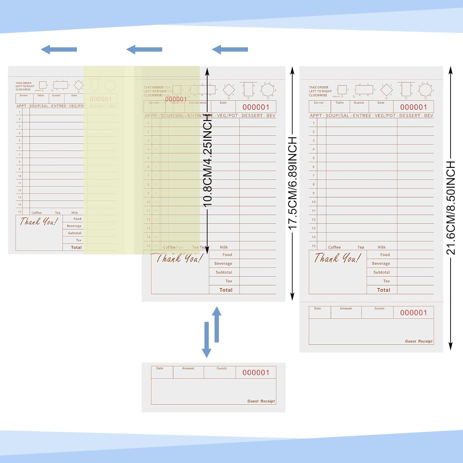 Features: Not just limited to restaurants and cafes, these guest check pads can be applied in various settings like bars, food trucks, guest houses, and even at events that require food service. They offer practicality and versatility, making them an invaluable tool for any food and beverage service business. The guest check pads are made of reliable paper material. This adds to their ability to be written on with ease, while the tan, white and yellow color make it suitable for recording information. Specifications: Material: paper Color: tan, white and yellow Size(about): 4.25 x 8.5 inches/ 10.8 x 21.6 cm Package includes: 10 x Guest check pads Notes: Manual measurement, please allow slight errors on size. The color may exist a slight difference due to different screen displays.