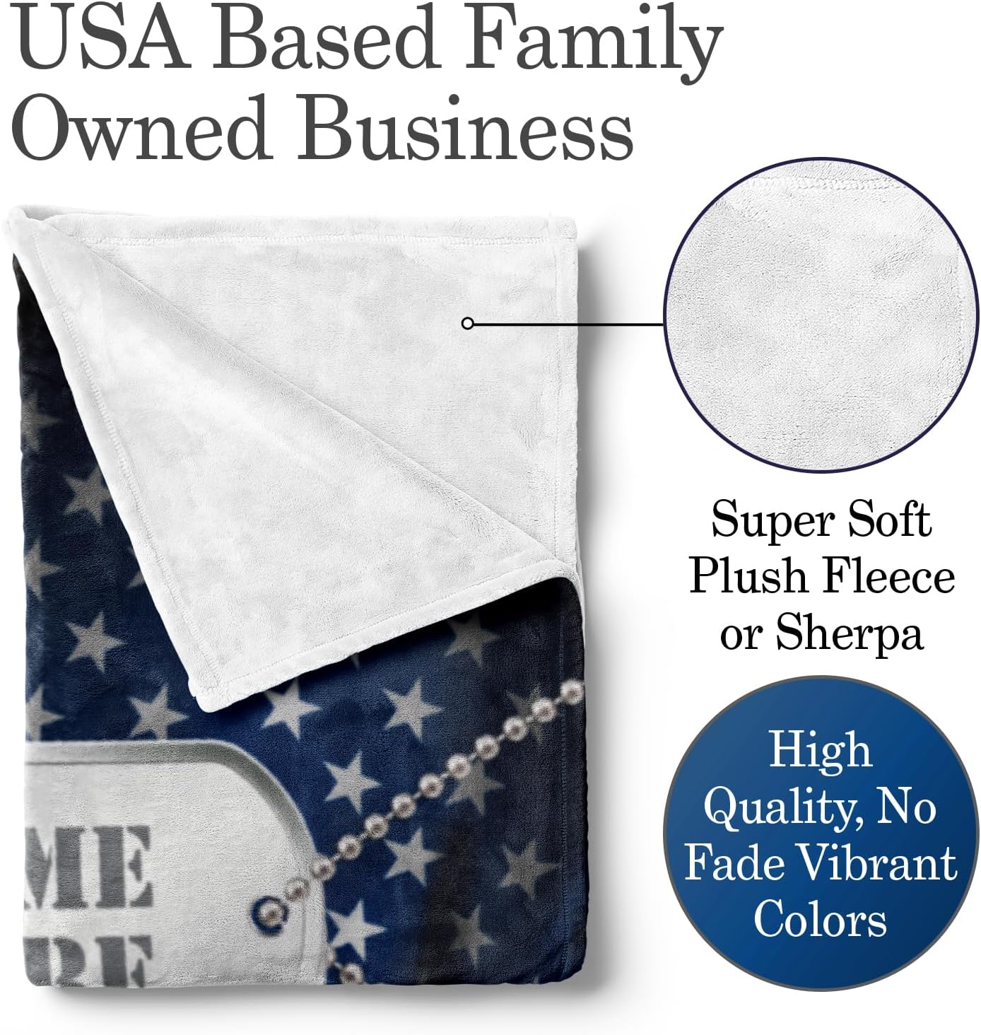Wrap yourself in the warmth of honor with our Custom Military Themed Blanket, a tribute to the brave men and women who serve our country. Crafted with the utmost care, this blanket is available in either luxurious fleece or cozy sherpa material, ensuring a soft, plush feel that's perfect for snuggling on the sofa bed or as an extra layer on your queen comforter set. The comfort of our fuzzy blanket is matched only by its versatility; use it as a throw blanket over your living room couch or as a bed blanket for those chilly nights. Personalization is at the heart of this blanket, making it a unique and heartfelt gift for veterans, active duty military, or anyone who holds the armed forces close to their heart. Customize it with a name to create a one-of-a-kind piece that will be treasured for years to come. The design is dye-sublimated into the fabric, ensuring it will not fade or wear, making it as durable as the military that inspired it. Whether you're looking for a warm blanket for those cold evenings, a couch blanket for your large sofa, or a queen bedding accessory that makes a statement, this custom blanket is the perfect choice. Our Custom Military Themed Blanket is not just a throw; it's a keepsake that celebrates service and sacrifice. It's an ideal gift for Veterans Day decorations, a thoughtful present for a military family, or a cozy addition to your own home. This sherpa or fleece throw blanket is designed to provide warmth and comfort, whether you're using it as a large throw blanket in your green bedding ensemble or as a bed throw in a teen boy's bedding setup. Plus, it's easy to care for—just machine wash and enjoy the lasting softness without any hassle. Embrace the comfort and the pride with this exceptional, military-inspired blanket.