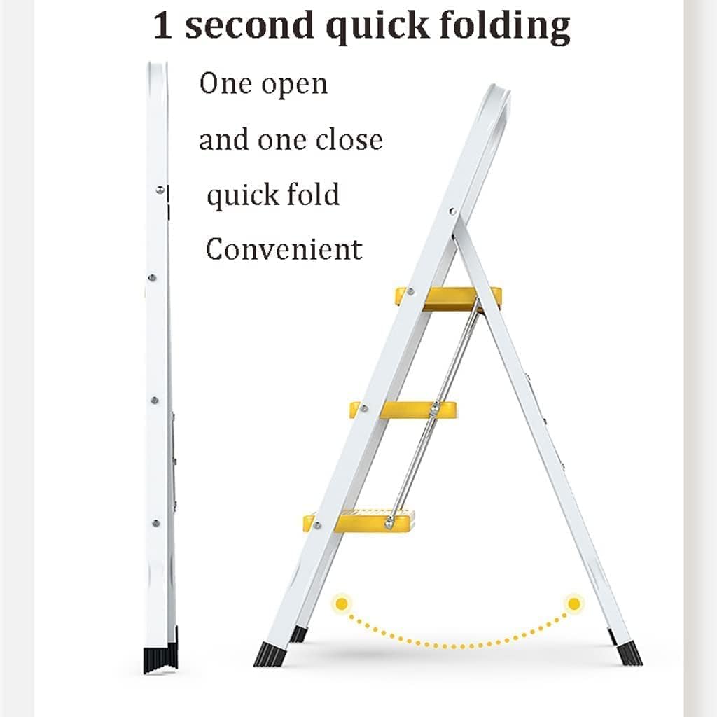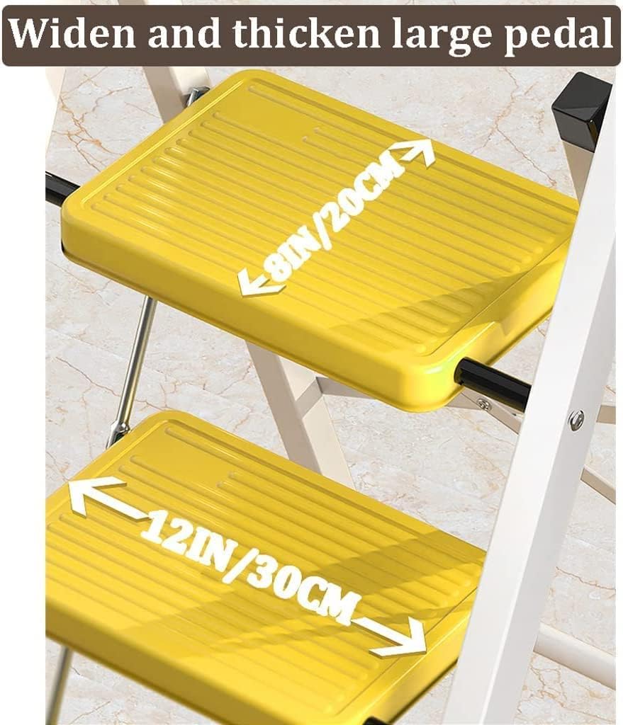 Easy Storage with Compact Design: The step ladder can be folded, quite portable & space-saving for storage. It's portable in your car trunk, or can be carried everywhere. Compact enough to slide under a bed, stash in a closet / behind a door, or simply lean against a wall.Ladder Type:Telescoping Ladders/Folding Ladder/Step Ladders Material: ironColor:Orange,YellowSize:2 Step Ladder: Expanded size: 46*51*78cm; Folded size: 46*5*86cm3 Step Ladder: Expanded size: 46*68*102cm; Folded size: 46*5*112cmLoad capacity:150KG/330LBWide Range:for home, attic, RV, outdoor work, building maintenance, window cleaning, decoration workPackage Included:1 x Ladder (excluding any products)Details: 1. Widen the pedal, deepen the texture of the pedal surface, increase friction, and not easy to slip. 2. Horseshoe-shaped foot pads are bi-directional, strong grip, stable support, not easy to slip, suitable for any floor, and will not hurt the floor.Wide Application:This ladder is a must-have for cleaning, painting, decorating, and all your DIY projects, it allows you to effortlessly reach those hard-to-access areas, perfect for home offices and both indoor and outdoor use, it takes the hassle out of your DIY or cleaning tasks, with this ladder, you can easily complete your projects.