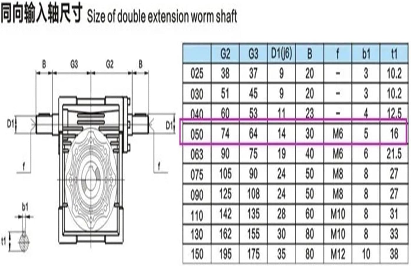 Worm Gearbox Speed Reducer NRV050-VS double input shaft 14mm Ratio 5:1 - 100 :1Worm Reducer*1pcNote:With gear ratio 5:1,7.5:1, 10:1, 15:1, 20:1, 25:1, 30:1,40:1, 50:1, 60 :1, 80:1, 100:1for customers. this link with ratio This is double shaft input reducer and hole output. if need shaft output, please contact us.We also have NMRV 25/30/40/63/75/90 Models, if need, contact us please.Color: silver and blue (sometimes just one color)Material for worm reducer:housing:aluminum alloy die castWorm gear: Nodular cast iron and bronzeDimensional drawing of worm reducer NRV050-VS:(unit:mm)We also have worm reducerparts such asoutput shft, torque arm and output flange,If you need to contact us to buy:NMRV50 Dual or Single output shaft:Torsion arm :NMRV50 Output flangeTorque : 21N.m-89N.mModel Number : NRV050/RV50Origin : Mainland ChinaOutput Voltage : 0.12KW - 0.75WInput Speed about : 1500rpmOutput Speed : Varies with changes in speed ratioOutput hole diameter : 25mm